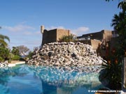 Se sitúa entre el castillo y una colina artificial, poblada de vegetación palmeras y vegetación exótica que está coronada por una estructura metálica, obra del genial Cesar Manrique. De esta colina parte una gran catarata que permite el llenado del lago, que en esta zona tiene varios metros de profundidad. En la lado norte se sitúa una réplica del "Faro de Ceuta" así como un pequeño embarcadero. En el centro del lago brota un gigantesco "geiser" de agua de varios metros de altura.